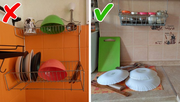 Сушилки для посуды обычно довольно громоздкие и занимают много места. Попробуйте вместо них использовать специальные коврики — их легко потом убрать, да и мыть очень просто.