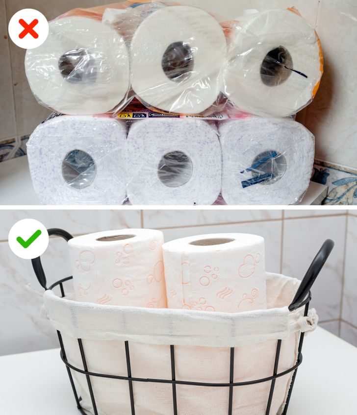 Вскрытые и разорванные упаковки туалетной бумаги, выставленные на всеобщее обозрение, не придают ванной комнате шарма. Если у вас нет отдельного места для хранения рулонов, рекомендуется извлечь бумагу из упаковки и поместить ее в элегантные контейнеры. Это не только придаст оригинальности интерьеру, но и будет выглядеть привлекательно и аккуратно.