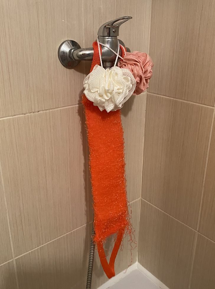 Лучше предоставить пестрым губкам и мочалкам отдельное место рядом с душевой или ванной. Их можно подвесить на крючки или сложить в пластиковый контейнер. Такой подход поможет избежать визуального беспорядка.