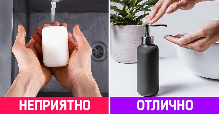 Кусковое или жидкое мыло — вопрос личных предпочтений. Однако если стоит задача — принять гостей, то предпочтение лучше отдать последнему. Не каждому приятно трогать кусок мыла, который до него брали в руки другие люди. Лучше поставить красивый диспенсер с жидким мылом.