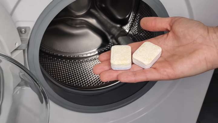 В пустую стиральную машинку отправьте две таблетки для посудомойки. Настройте самую высокую температуру и отжим, добавьте дополнительное полоскание.