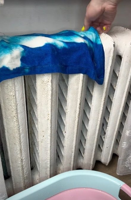 Все что нужно для быстрой чистки батарей — мокрое полотенце и фен. Поместите мокрое полотенце за батарею.