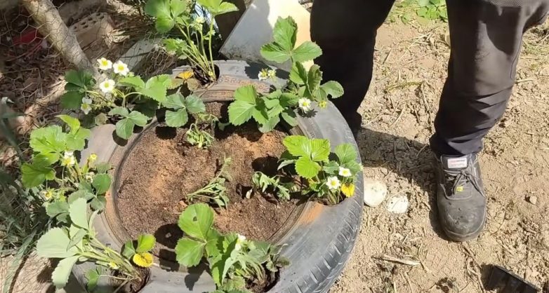 Поместите клубнику в подготовленные лунки. В центральную часть покрышки можно посадить другие культуры, например, томаты.