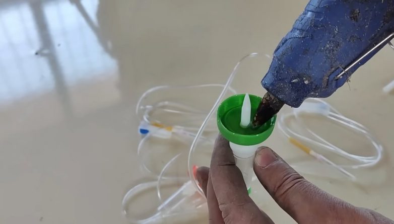 Для изготовления удобной системы капельного полива понадобятся пластиковые бутылки и медицинские капельницы. Зафиксируйте капельницу в пробке от бутылки с помощью горячего клеевого пистолета.