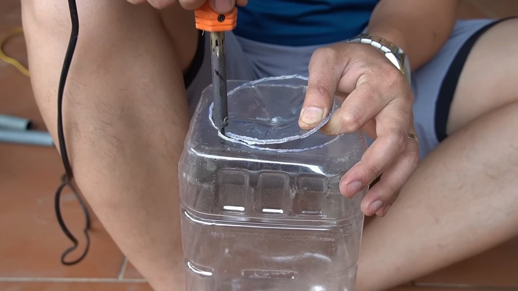 Используя паяльник, вырежьте дно каждой пятилитровой бутылки.