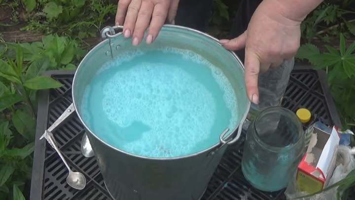 В ведро наберите 10 л воды. Отдельно, в литровую банку с водой, добавьте по 1 ст. л. соды и уксуса 9 %. Сюда же добавьте 1 ст. л. медного купороса.