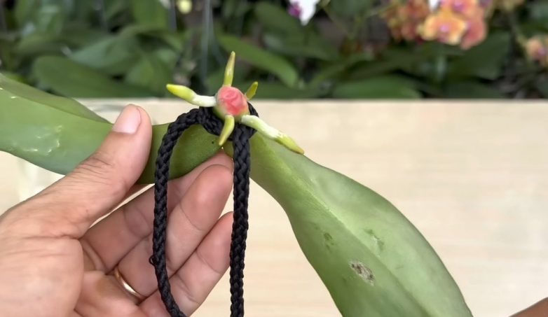 Для дальнейшего ухода за орхидеей необходимо завязать на ствол шнур, который хорошо впитывает воду. Шнур будет временной заменой корней растения.