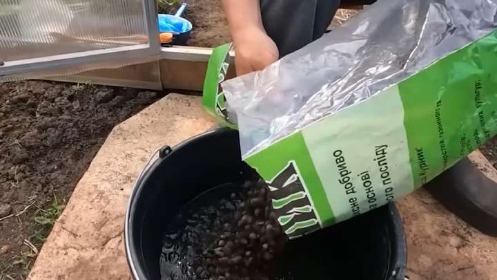 В 5 л воды всыпьте 5 кг курника. Сюда же добавьте 250 мл микробиологического средства Байкал-Эм. Тщательно размешайте.