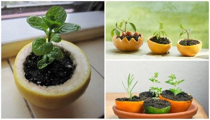 Как превратить простую кожуру в вазон: внизу кожуры проделайте отверстия для дренажа и заполните почвой. Теперь посадите в землю несколько семян и не забудьте полить водой. Грядка готова! Кожура апельсина, лимона, грейпфрута даст растениям много полезных веществ.