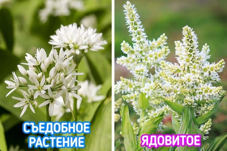 Чемерица (на фото справа) растет на лугах и холмах. У нее небольшие цветки кремового цвета, которые покрывают стебель таким образом, что он напоминает кукурузу. Из-за внешнего сходства чемерицу иногда путают с черемшой (на фото слева). Вот только последняя съедобна, а чемерица ядовита.