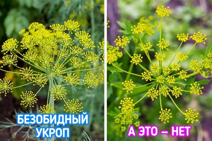 Болиголов (на фото справа) встречается на обочинах дорог, рядом с ручьями и полями. Его нередко путают с безобидными растениями, например купырем лесным (на фото слева). Отличить болиголов поможет неприятный запах, исходящий от листьев, если их надломить.