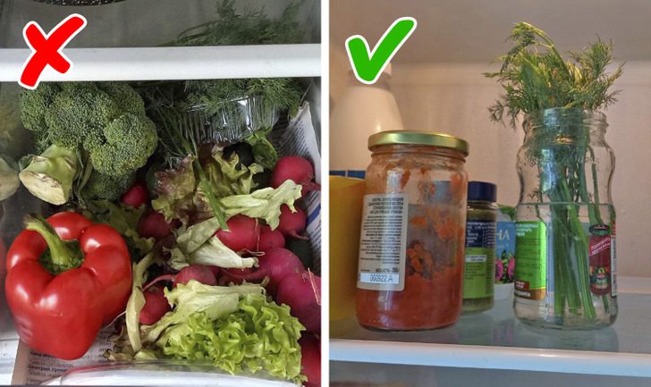 Зачастую нижние полки холодильника используются для хранения сырых овощей и зелени. Но если поставить пучок укропа или салата в стакан с водой, он надолго сохранит свою свежесть. Кстати, куда более эстетично будет выглядеть кувшин с молоком, нежели приоткрытые упаковки с пестрыми этикетками.