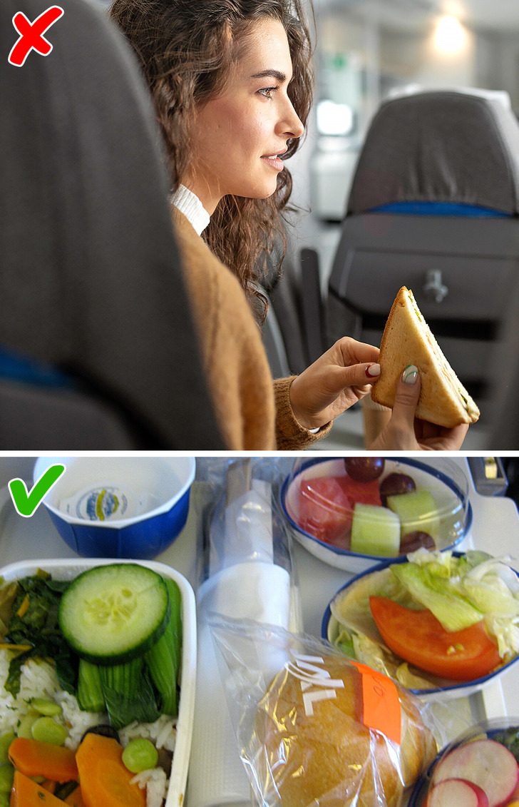 Из-за отсутствия физической активности в самолете, наша пищеварительная система перерабатывает еду медленнее. Это может вызвать дискомфорт, вялость и вздутие живота. Чтобы минимизировать последствия, лучше не употреблять во время полета тяжелые углеводы, такие как хлеб, макароны, соленые продукты, жареную пищу и сливочные соусы. Сделайте выбор в пользу более легкой еды.