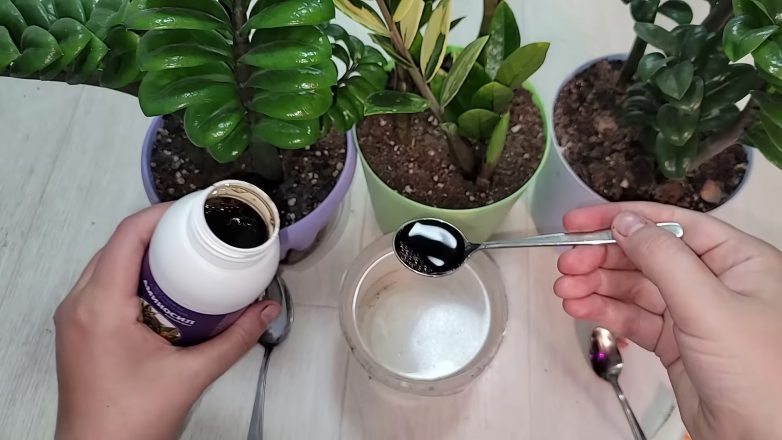 Чтобы не тратить много времени и не покупать дорогие химические удобрения, попробуйте использовать для подкормки замиокулькаса этот простой раствор, который готовится из двух ингредиентов. После использования такой подкормки, листья будут очень упругими, они не буду увядать и желтеть. Будет активно развиваться корневая система, что поспособствует нарастанию зеленой массы. Более того, внесение подкормки поможет повысить иммунитет растения и поможет ему легко адаптироваться к различным условиям содержания.
