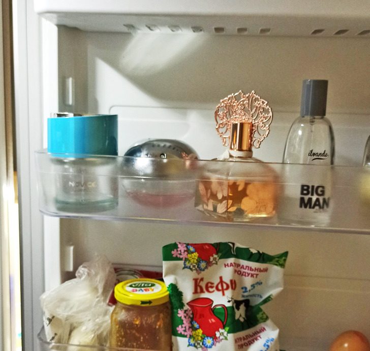 Парфюм лучше хранить в холодильнике, особенно в жаркие летние месяцы. Дело в том, что жара в комнате или в ванной, в которой к тому же еще и влажно, может привести к разрушению химических соединений, составляющих парфюм. В холодильнике же температура более стабильная, что способствует сохранению аромата на более длительный период. Также в холоде парфюм защищен от прямого воздействия света, который негативно влияет на стойкость и качество аромата.