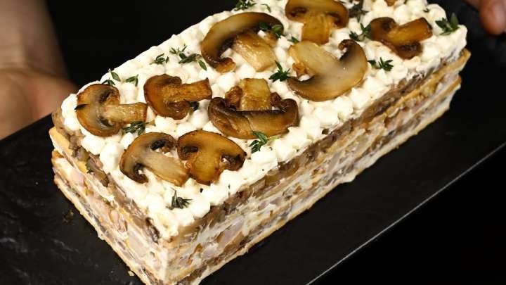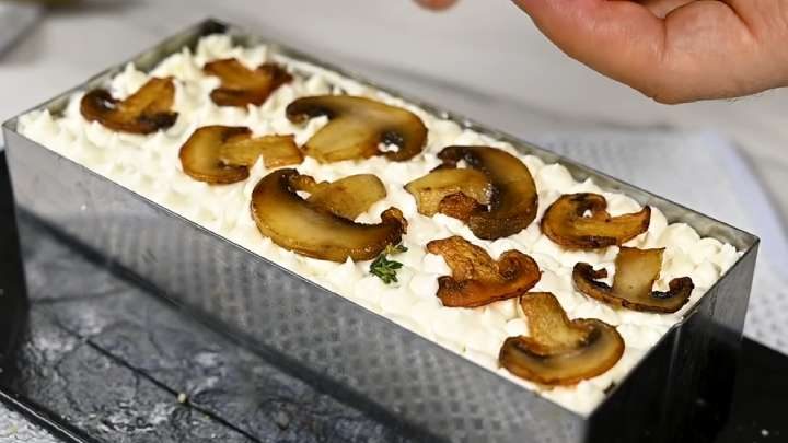 Финальный штрих: оставшиеся обжаренные грибы + весь крем + грибы для украшения. Сверху прикройте пищевой плёнкой и отправьте в холодильник на ночь (6 часов).