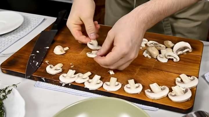 Несколько грибов нарежьте ломтиками. Выберите ровные, крепкие и оставьте их для украшения. Оставшиеся грибы просто мелко пошинкуйте, как и лук.