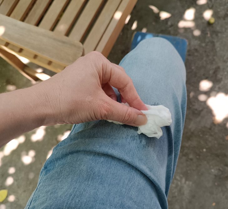 Детские влажные салфетки удивительно эффективны, потому что в них содержатся мягкие чистящие средства. Они помогут справиться с различными пятнами на одежде, главное — использовать их как можно быстрее, пока грязь не успела впитаться в ткань и засохнуть.