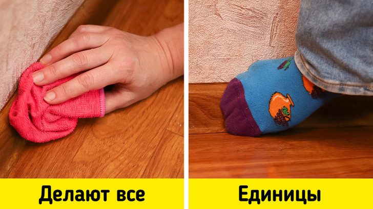 Мытье плинтусов — то еще удовольствие. Пыль и грязь там оседают быстро, но добраться туда с помощью обычной швабры бывает сложно. Если нет желания ползать на коленках по полу, можно пустить в ход ноги. Нужно просто обернуть чем-нибудь стопу и надеть сверху старый носок, смоченный в щадящем чистящем средстве. Теперь для мытья плинтуса даже наклоняться не придется.