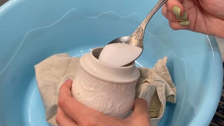В таз насыпьте 2 ст. л. обыкновенной поваренной соли и 3 ст. л. кислородного отбеливателя/пятновыводителя (без хлора). Положите полотенца и залейте крутым кипятком.
