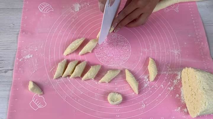 Разделите тесто на две части, каждую скатайте в длинный тонкий жгут и нарежьте на кусочки.