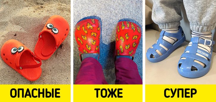 Избегать покупки такой обуви точно стоит родителям тех детей, которые только начали ходить. У подобных тапочек нет нужной поддержки, и нагрузка на ногу распределяется неравномерно из-за свободной пятки. Детям постарше тоже не стоит носить такую обувь на постоянной основе — причина та же самая. А если обувь выполнена из вспененного пластика или похожего на него материала, то в них очень легко поскользнуться, если носить во время активных игр.