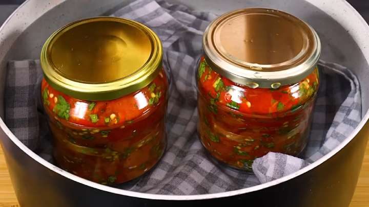 Разложите перец по сухим, чистым баночкам, прикройте крышками. Поставьте банки в кастрюлю, дно которой устелено полотенцем. Налейте воду по плечики банок. После закипания стерилизуйте 35 минут. Готовый салат из печёного перца с чесноком и зеленью можно отправить на хранение!