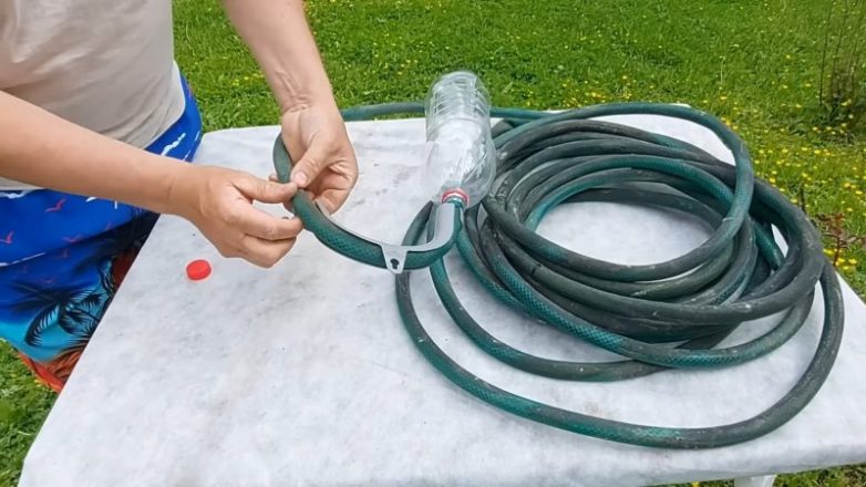 Обрежьте шланг и вставьте его в горлышко пластиковой бутылки.