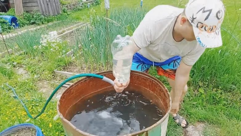 Погрузите бутылку в бочку с водой, а затем переверните ее, чтобы вода наполнила шланг. Как только вода потечет из противоположного конца шланга, опустите бутылку на дно бочки.