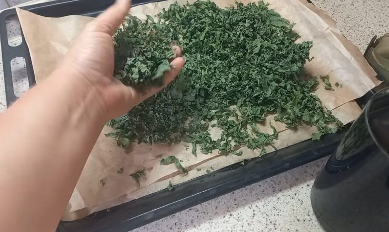 Разложите зелень на противне, застеленном пергаментной бумагой, и отправьте листья в духовой шкаф, прогретый до 50 градусов. Процесс сушки листьев хрена следует осуществлять при открытой дверце духовки.