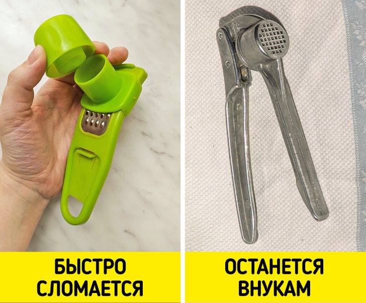 Железные прессы для чеснока считаются самыми надежными, поэтому пора достать из глубин шкафа старую бабушкину чеснокодавку, способную прослужить еще лет сто. Маленький совет: чтобы сохранить ее в отличном состоянии, промойте пресс сразу после использования или хотя бы замочите в воде. Тогда не придется муторно отковыривать от поверхности засохший чеснок.