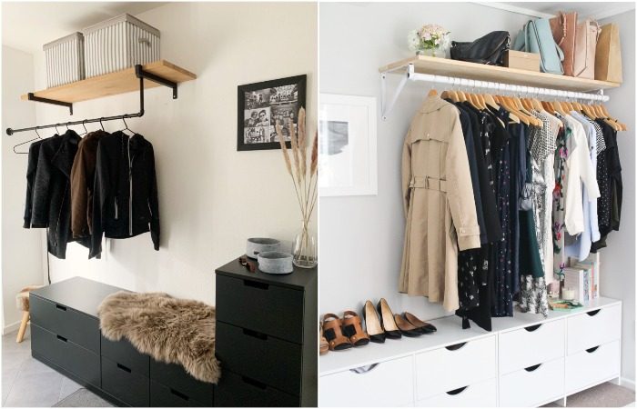 И первое, о чем следует подумать – на что заменить массивный, отдельно стоящий шкаф. Делимся несколькими актуальными вариантами.
