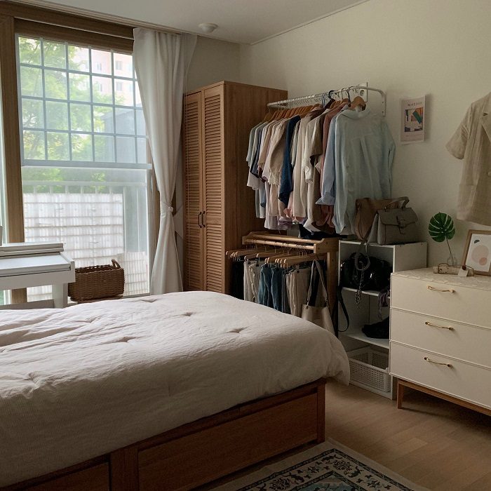 Такое хранение не оставит иного выбора, кроме как всегда поддерживать порядок в комнате – только опрятная и аккуратно развешенная одежда! Конечно, всю эту одежду можно было бы поместить и в закрытый шкаф, но тогда конструкция получится слишком внушительной и громоздкой, не оставит никакого чувства простора.