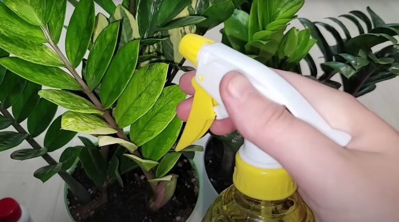 Для приготовления второго средства к 1 л воды добавьте 1 ст л угля и 1 ст л уксуса. Повысить эффективность средства поможет 1 мл Эпина. После того как раствор настоится минимум 4 часа, профильтруйте его через марлю или мелкое сито. Опрыскивать замиокулькас по листу рекомендуется 1 раз в неделю.