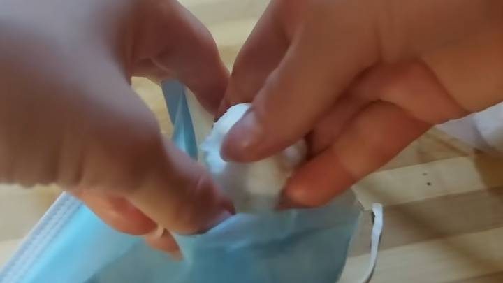 Слепите шарики и положите их в разрезанную маску для лица. Завяжите.