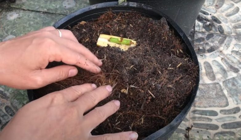 Положите банан в горшок с рыхлой плодородной землей, слегка присыпьте землей и обильно полейте.