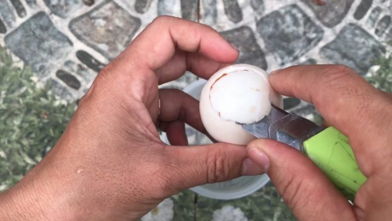 Аккуратно срежьте верхнюю часть яйца так, чтобы не повредить скорлупу.
