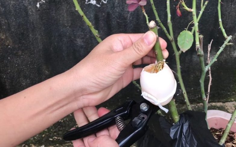 За 30 дней на срезанном месте ствола начнет активно развиваться крепкая и здоровая корневая система. Срежьте черенок с корнями и аккуратно удалите скорлупу.