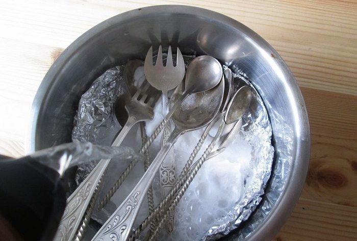 Налейте в кастрюлю пару стаканов воды, поставьте на плиту и доведите до кипения. Добавьте фольгу, нарезанную на кусочки, 100 миллилитров уксуса и две чайных ложки соды. После этого положите столовые приборы в кастрюлю и прокипятите пять минут. По истечении времени дайте им остыть, а затем хорошо промойте в проточной воде и вытрите насухо.