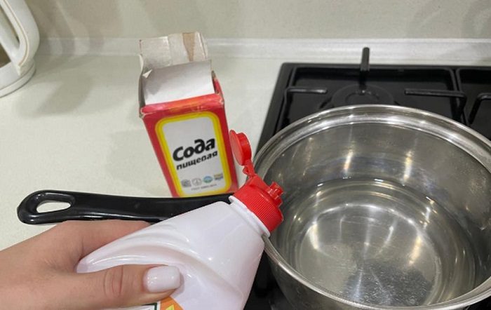 Итак, в пригоревшую кастрюлю нужно добавить немного воды, моющее средство для посуды и соду, после чего поставить ее на плиту и прокипятить. Через несколько минут вы заметите, что нагар отходит сам, а вам нужно только протереть посуду губкой и смыть все проточной водой. Обратите внимание, что лучше всего средство работает со свежими загрязнениями, поэтому не затягивайте с чисткой.