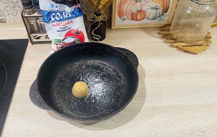 Мы же предлагаем свести «общение» чугуна c водой к минимуму. Для этого возьмите сковороду, на участок с застарелым жиром насыпьте соль, подождите 10-15 минут, а затем натрите всю поверхность половинкой картофеля. Нагар и пятна уйдут в два счета, и посуда вновь станет как новая.
