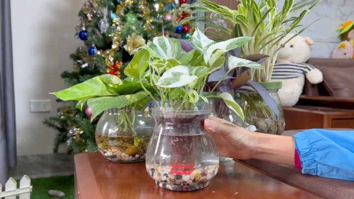 Крышку ослабьте (не закручивайте до конца). В банку налейте воду, для декоративности можете положить на дно камушки. Вставьте горлышко бутылки в банку. Субстрат увлажнится, и черенки начнут укореняться! По желанию в воду можно добавить корневин.