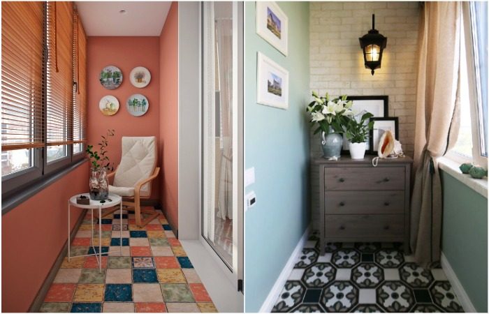 Еще один способ преобразить пространство – позаботиться о красивом напольном покрытии. В классическом варианте обычно выбирают линолеум или ламинат под дерево, однотонную плитку, которая не выделяется на общем фоне. Но если вы хотите, чтобы отделочный материал стал ярким акцентом в интерьере, тогда отдавайте предпочтение оригинальной плитке с узорами. В холодное время года, когда за окном сыро, ветрено и дождливо, подобная отделка делает лоджию гораздо более уютной и интересной.