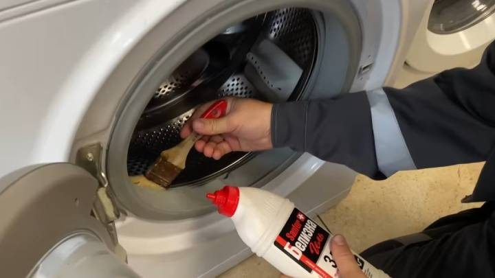 На следующий день включите режим «Отжим+слив», затем откройте машинку и проверьте манжет. Он должен быть практически идеально чистым. Остатки плесени «добейте» белизной гелем. Нанесите его на манжет удобным способом (обязательно работайте в перчатках), оставьте на полчаса, затем смойте чистой тряпкой. Можете прогнать полный цикл машинки с пустым барабаном ещё раз, чтобы вода вымыла остатки белизны. После этого дверцу оставьте открытой, чтобы белизна улетучилась.