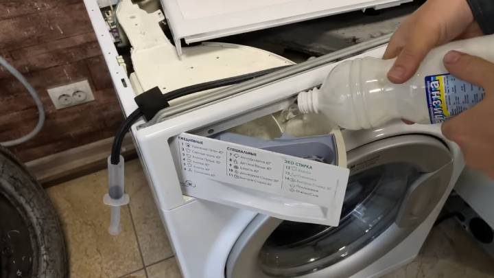 Включите пустую машинку на любом режиме, где есть нагрев воды до максимальной температуры 90 градусов (стандартно это «Хлопок»). В отсек для порошка налейте 2 л белизны (не геля, а именно жидкости, которая стоит копейки). По необходимости через отсек порошкоприёмника долейте воды, чтобы в барабане вода с белизной покрывала большую часть плесени на манжете.
