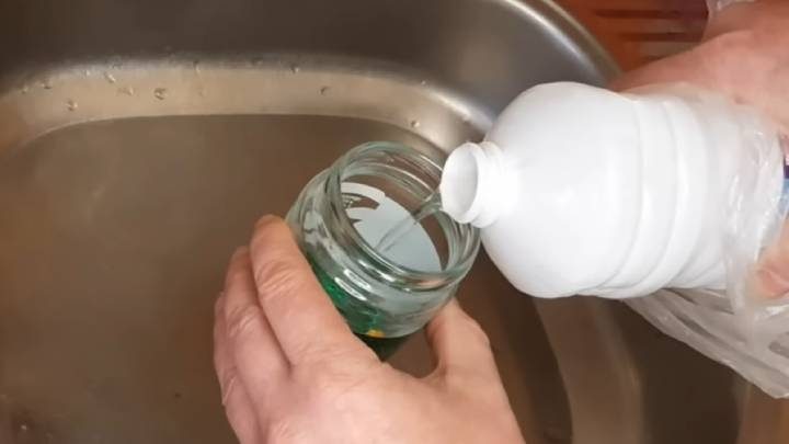 Наконец, если засор сильный, то в банке смешайте жидкое моющее средство (около 2 ст. л.). И примерно 100 мл белизны.