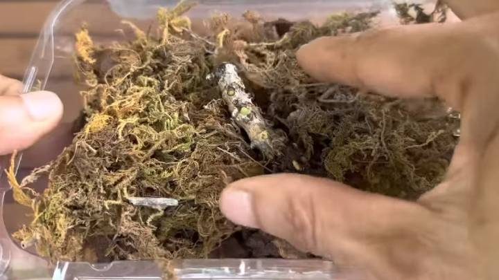 Далее, увлажняйте мох каждые 3 дня из пульверизатора. Держите контейнер закрытым (в нём должны быть отверстия для вентиляции). Через 2-3 недели начнут проклёвываться корешки.