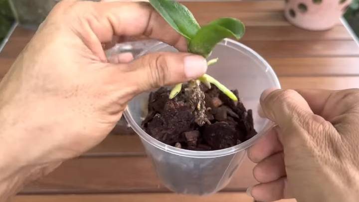 Когда орхидея наберётся сил и вырастет из контейнера, её нужно будет пересадить в кору, как обычно.