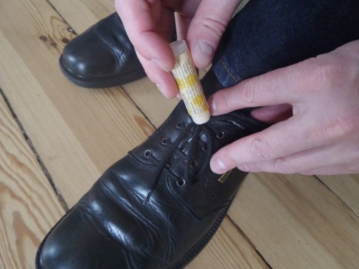 Гигиеническая помада позволит сделать шнурки не такими скользкими, поэтому им будет сложно развязаться самостоятельно. Кстати, вместо косметического средства можно использовать обычный вазелин – он обладает теми же свойствами. Самое главное, что вам больше не придется спотыкаться!