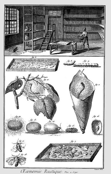 Цикл производства шёлка, иллюстрация из труда «Энциклопедия, или толковый словарь наук, искусств и ремёсел».
